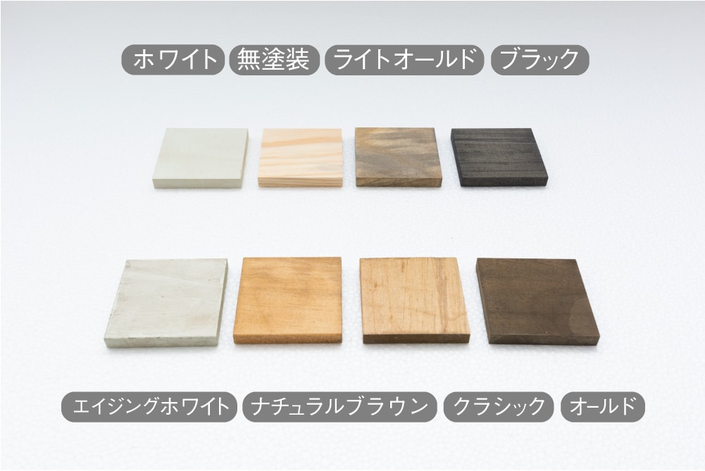掲載のカラーチップサンプルは、パイン無垢材のものを使用しております。マルシェ3段ディスプレイラックは、パイン集成材(ニュージーランド産)のため、同じ色味を再現できない場合がございます。塗装をご希望の場合で、仕上りの色味が気になる場合は、事前にお問合せください。